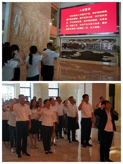 进入展厅,首先映入眼帘的便是庄严的入党誓词和“不忘初心、牢记使命”八个大字。在肃穆的氛围中,党委书记、董事长简玮仪带领大家面向党旗郑重宣誓,重温入党誓词,“我志愿加入中国共产党……对党忠诚,积极工作……”,铿锵有力的声音环绕整个大厅,进一步表达了纺织人听党话、跟党走,严守党的纪律规矩,忠诚履职尽职的坚定决心与信心。