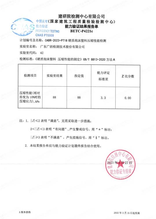近日,广东广纺检测技术股份有限公司收到国家建筑工程质量检验检测中心(建研院检测中心有限公司)组织的“硬质泡沫塑料压缩性能的测定”能力验证结果满意证书。